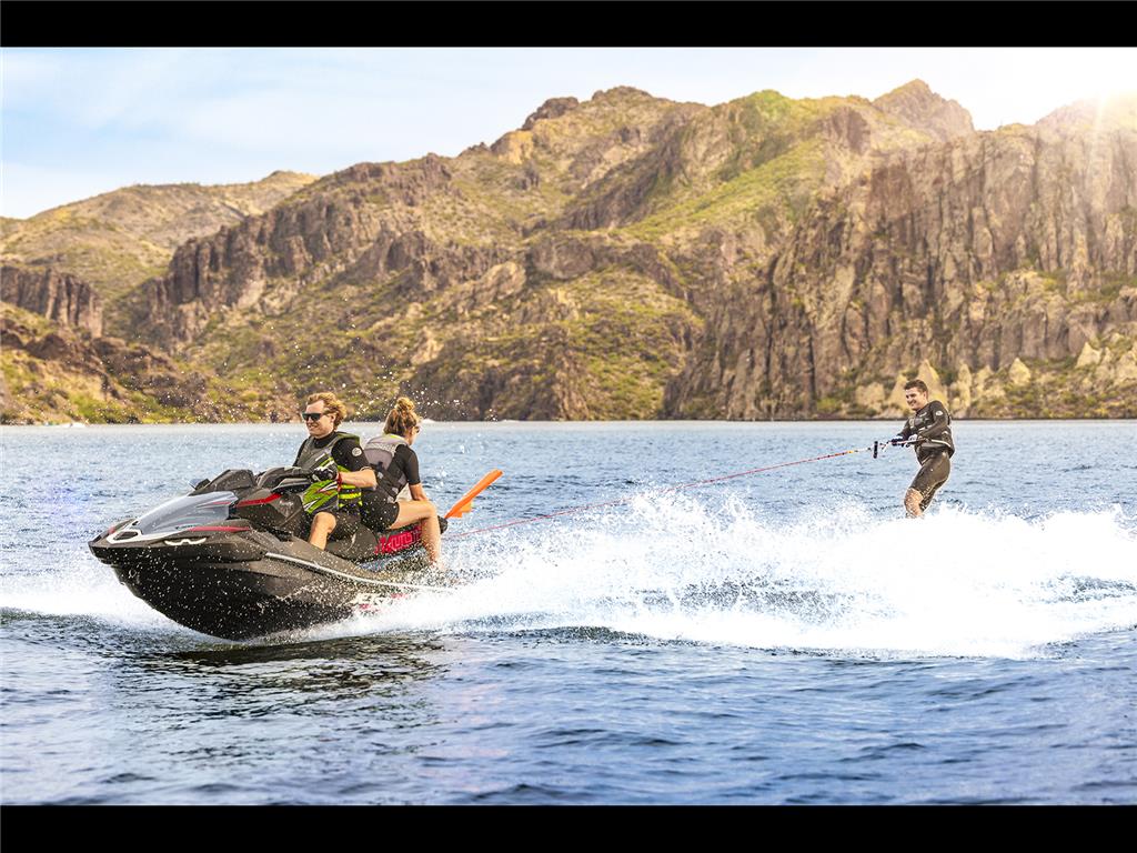 Rearview camera mounted aft of the rear seat offers riders a supplemental rearward view behind the watercraft. Convenient when towing a waterskier or wakeboarder, or when docking.