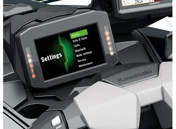 Kawasaki Smart Reverse with Deceleration electrically deploys the reverse bucket. Activated with a thumb switch on the right handle, it enables thrust to be controlled with one hand. When deployed, the reverse bucket contributes to deceleration.